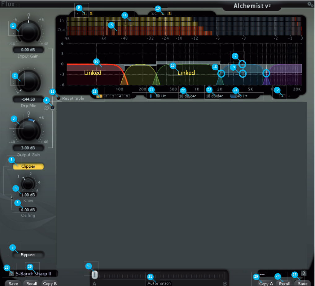 This section manages the wide band behavior of the Alchemist plug-in. It also controls the number of band of the processing (27) and the selection of the band setting panel (22).
