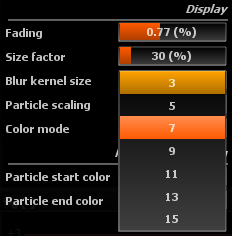 Controls display persistence, i.e. the “fade to black” amount for a frame. Lowering this value retains past particles longer, whereas increasing this make them disappear faster.