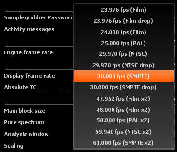 Sets the frame-rate used for time display in various parts of the program. Set it to match the frame-rate of your source material to facilitate locating time events, when working with film, TV or other time-stamped material.
