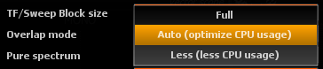 The overlap mode setting determines how much incoming audio frames overlap each-other. A higher overlap results in a smoother display update, at the expense of increased CPU usage. The available settings are: