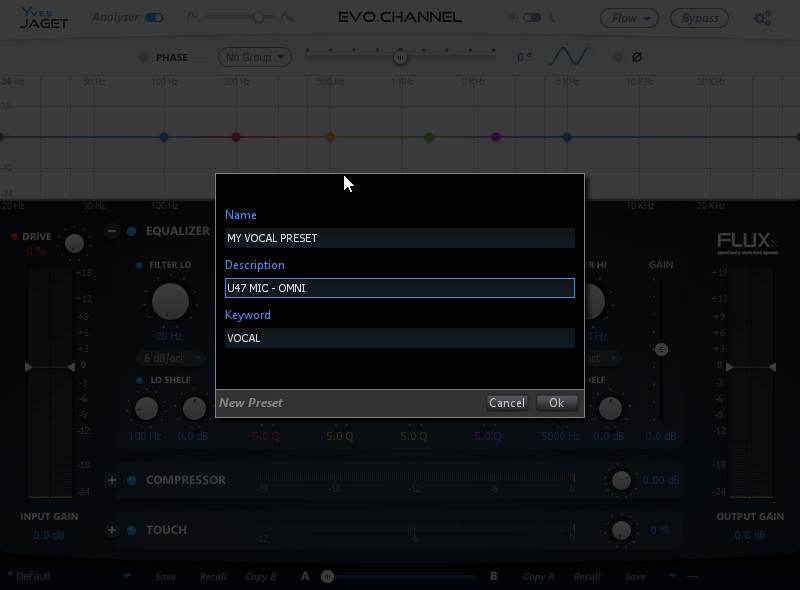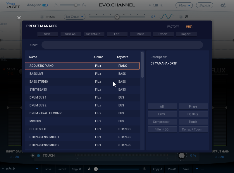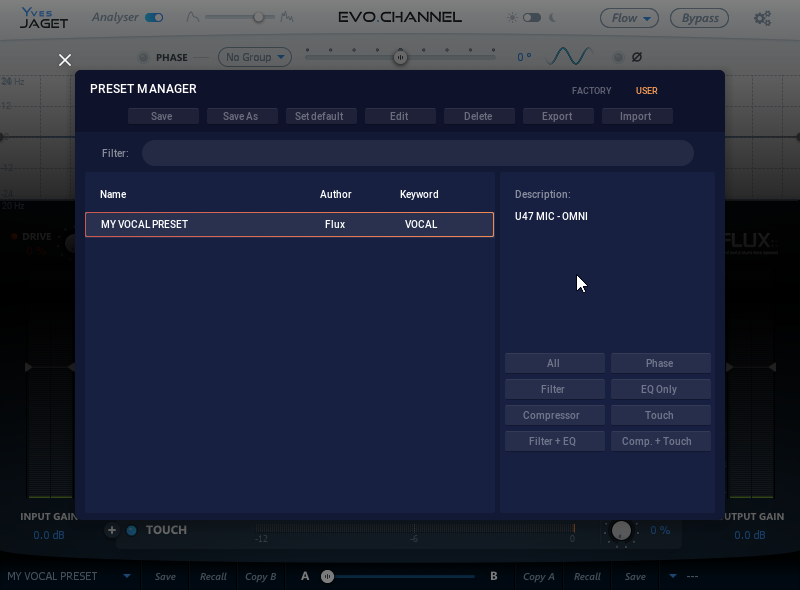 The preset manager contains two preset banks, the Factory bank contains factory presets, this bank is not available for saving of presets but any of the presets can be loaded into a preset slot and then saved into, the User bank, where all user presets are saved.