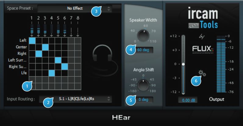 The routing matrix gives an overview of the mapping between the plugin’s inputs from the DAW track to the virtual speaker internal outputs. The virtual speaker outputs are down-mixed to stereo using a virtual speaker processing algorithm.