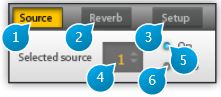 The source tab is where sources parameters are set and visualized. In essence, input channels are actually fed to one or several virtual sources that are placed inside a virtual 3D acoustic space. The user can precisely control the location of the sources in the virtual acoustic space, and adjust a number of parameters separately for each source.