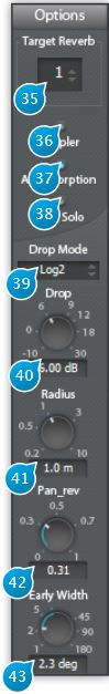 Owing to a fundamental law of acoustics and geometry, namely energy conservation, sound pressure drops in level as one moves away from the source. Choose “Log2” for an acoustically accurate setting, which corresponds to a “Drop” value attenuation every time the distance from the source is doubled (logarithmic behaviour), or “Linear”, for a less radical drop law.