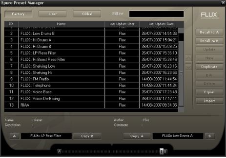 A plug-in features two preset sections : A & B. Clicking on the slot of a specific section reaches the shared preset bank. From the preset management window you can select the preset you want to recall in the specific preset section.