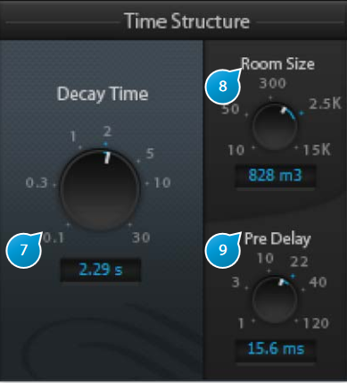 Please bear in mind that the master decay and high/mid/low controls are interactive, which means that the same audible result can be attained with different settings. This is intentional, as this allows you to get to the result faster and in a manner suited to your personal habits. Generally speaking, it might be more convenient to adjust the master decay time using the resulting sound as a guideline, then fine tune using high and/or low decay controls and leave the mid decay at the default setting. On the other hand, if you specifically to concentrate on the mids, for example to create a ‘hollow room’ sound, it’s easier to focus on the mid decay control, leaving hi and mid decay untouched.