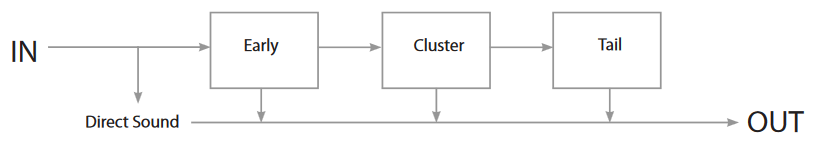 The input is fed in parallel to the early reflections generator, abbreviated EARLY. Early reflections play a crucial role in our spatial perception of sound, as they allow us to build a mental representation of the surrounding environment (locations and materials of the walls, fl oor and ceiling). These reflections vary with source position and are panned accordingly.