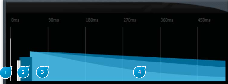 The grey bar at the start of the reverberation pictogram represents the direct sound send at the input of the plug-in. In the time structure of the reverberation, it is the first element that is heard.