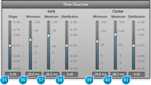 Early reflections distribution. Determines the way early reflections are scattered in time, inside the Early Min. / Early Max. interval. The default setting of 0.5 corresponds to regularly spaced reflections, above these are more grouped towards the Early Max. value, and vice-versa.