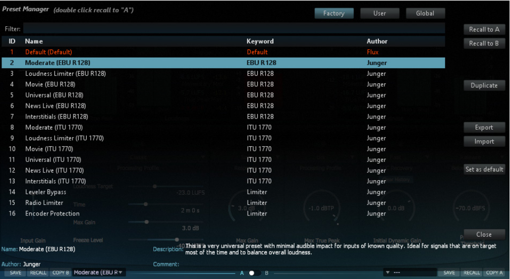 The preset manager contains three preset banks:
