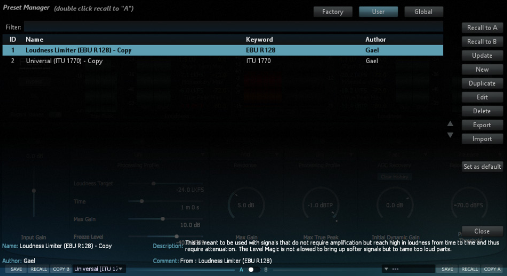 | Duplicate Creates a copy of the selected preset and saves it to the preset bank. |
