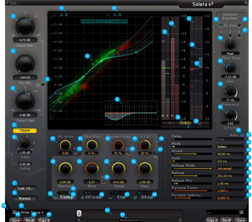 Inverts the phase of the processed signal by 180 degrees. The phase flip applies to the detector Equalizer Solo (40) as well.