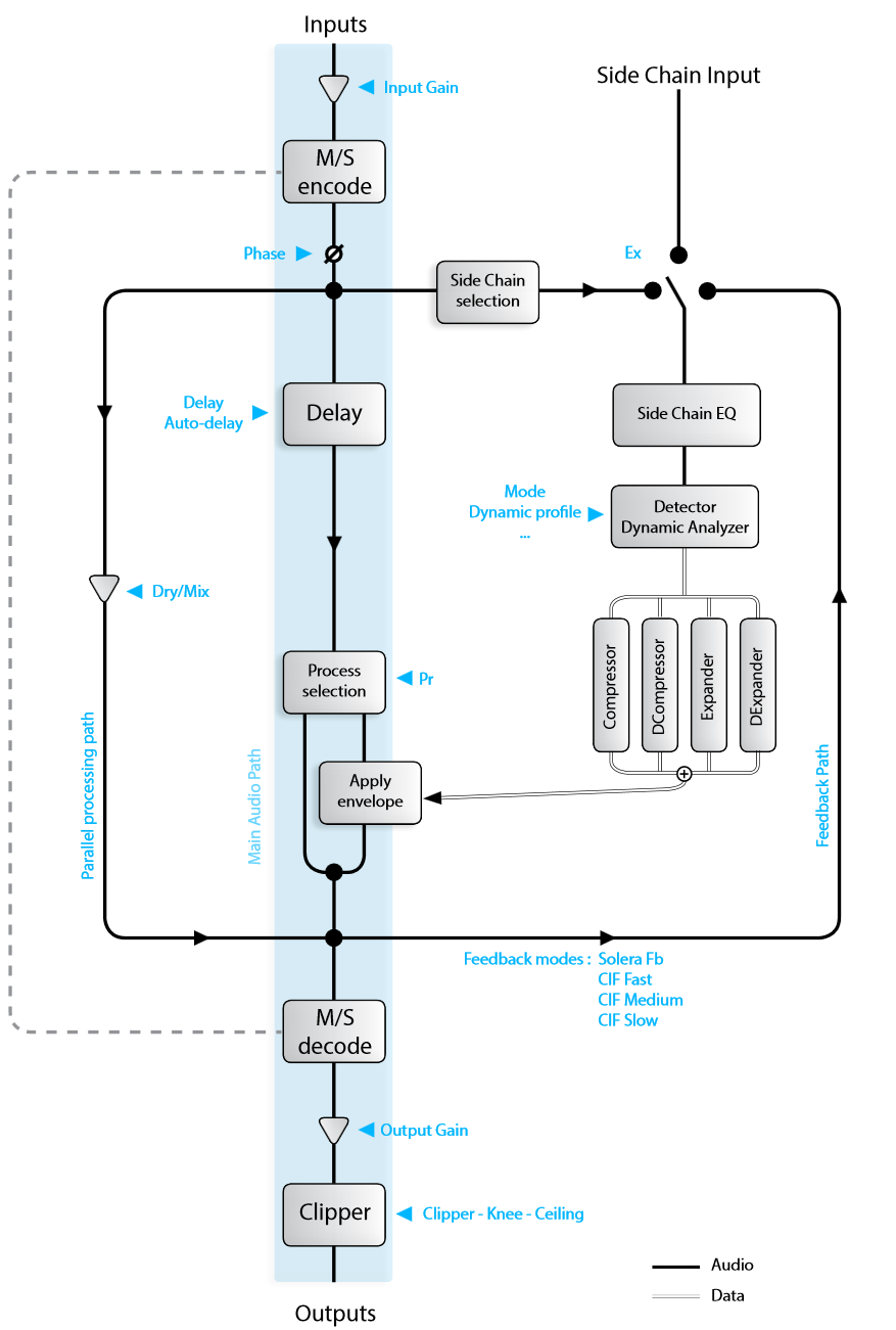 The Solera dynamic processor is a comprehensive dynamic processor providing a compressor, expander, de-compressor and de-expander, that each may be enabled individually, all processing in parallel using one single common detector.