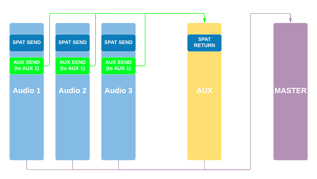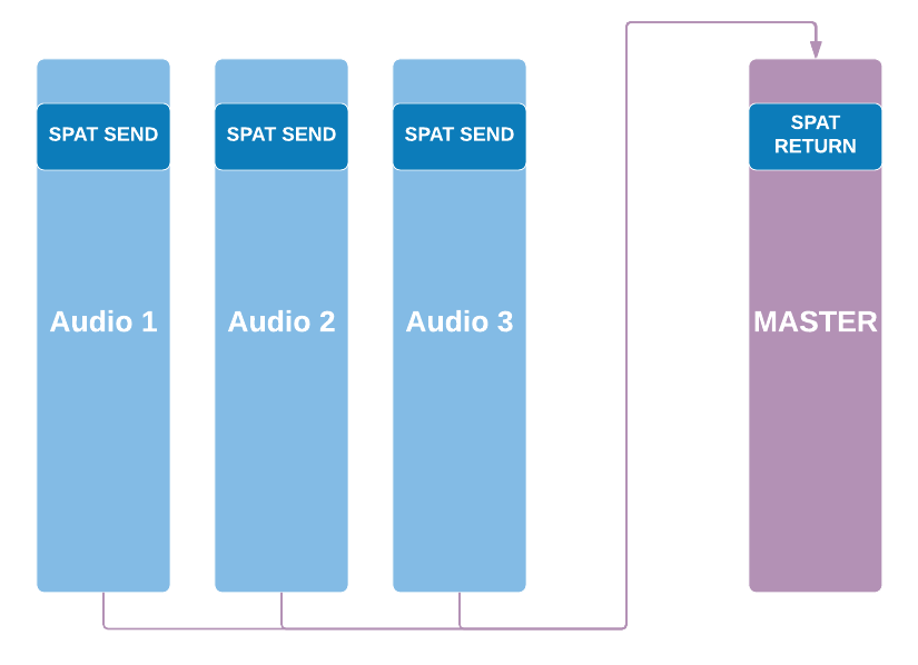 The above best practice ensures as well that you keep both the dry signal and the SPAT RETURN signals independent (when the mix requires to switch easily from one to the other), add one object AUX track per audio track to be sent to SPAT, and insert the SEND plug-in on these object AUX tracks.