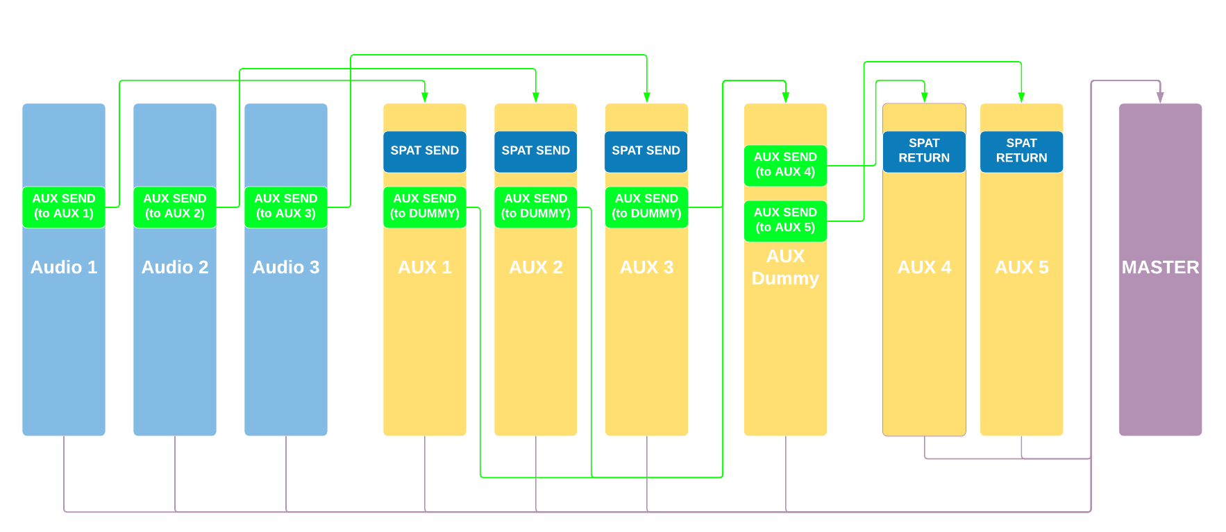 As it can quickly become complicated as the project grows, in the following example, the use of a ‘dummy’ track, avoids using several AUX sends on the ‘SEND ’tracks. It makes routing clearer and easier to implement on larger projects. The ’dummy’ AUX track is routed to all the RETURN tracks (using AUX sends or patching the output to a multichannel/multi-format ‘dummy’ bus).