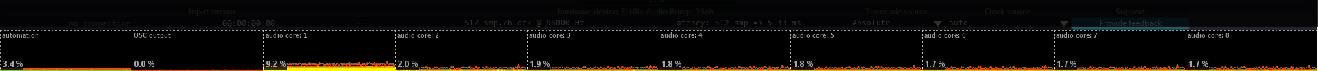 SPAT Revolution v20.12 introduced a new Multi-Core Parallel Computation Algorithm that is key to optimizing your hardware. This is for both the automation and the audio processing. The Display Performance option stated above will be our best ally to monitor the results. This can be accessed with shortcuts Shift + Option + Command + P.