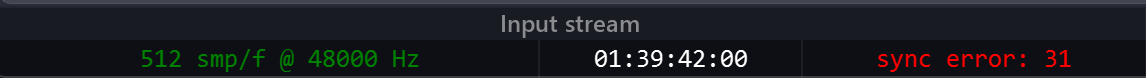 Frame size (sometimes called buffer size or block size) should be matched in the host DAW and SPAT Revolution. A red message would identify a different frame rate the host DAW. Simply double-clicking on smp/f message in error will automatically change you SPAT block size setup to match the incoming audio.