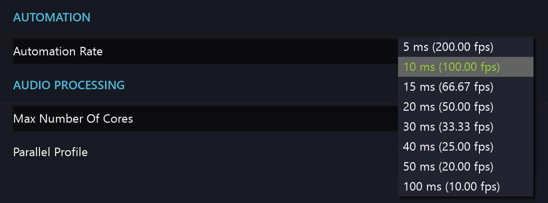 Automation Rate provides the ability to set the refresh rate (frequency) of the automation. By default, we use 10.0 ms (100.00 fps). This can be decreased to lower the frequency if you see that automation is becoming a burden for your system with such a fast refresh.