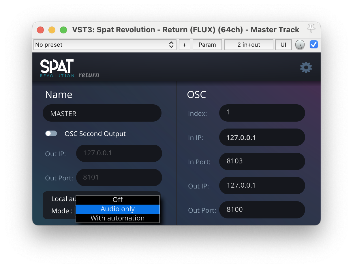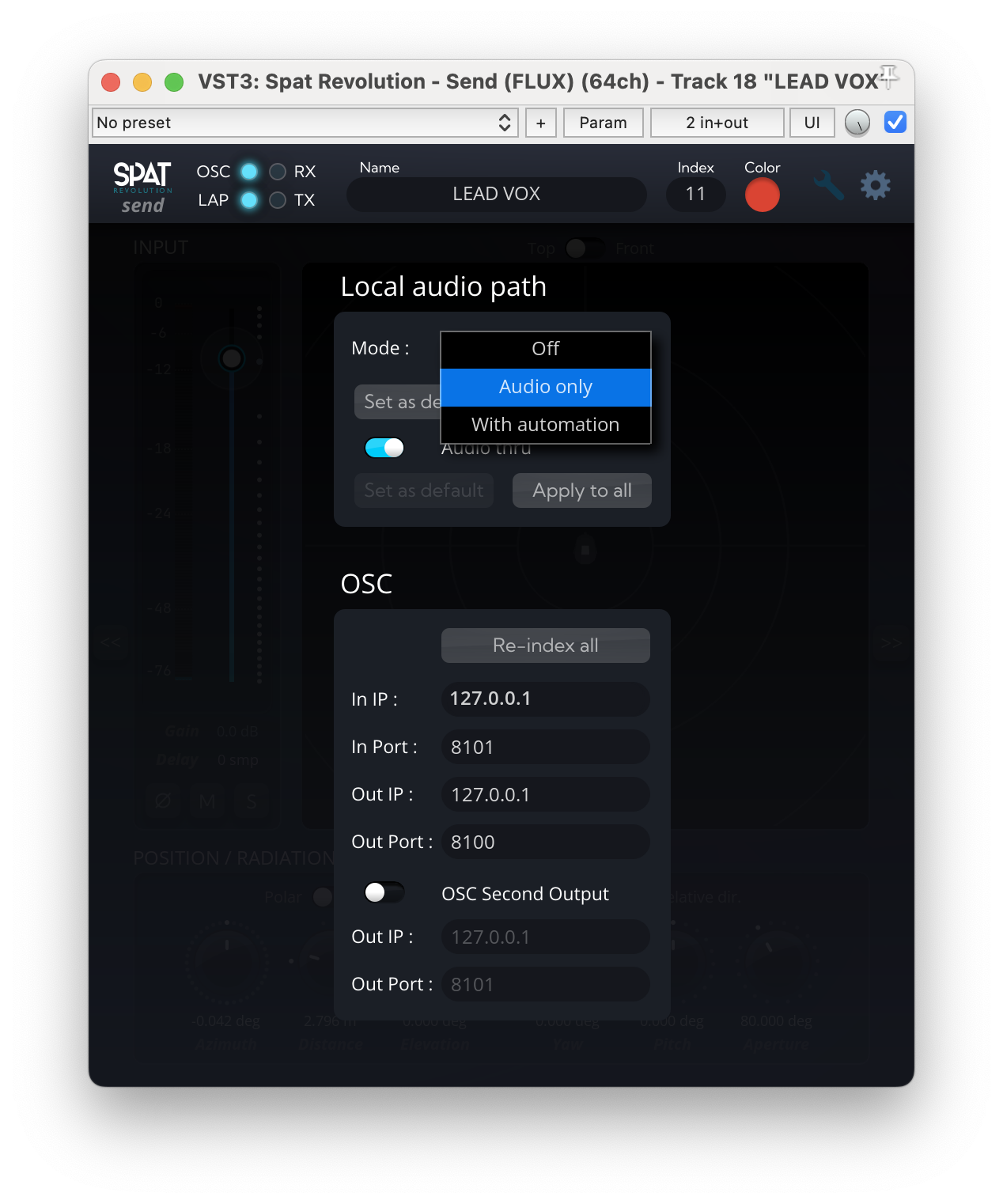 Local audio path - Enable the inter-application software stream. In the SPAT Revolution Send plugin, you have the possibility to use Local audio path for both automation and audio, or only for audio. This last mode lets you use the OSC for the automation.