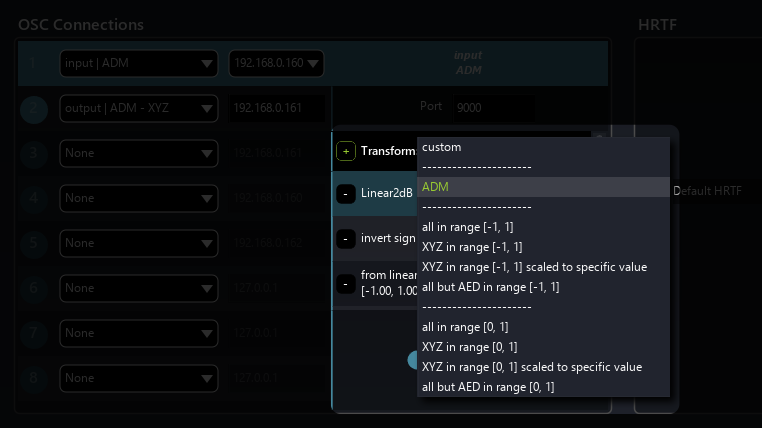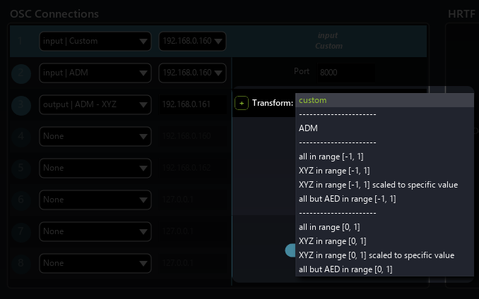 Transform presets are accessible for each OSC connection and allow quick re-scaling of the values.