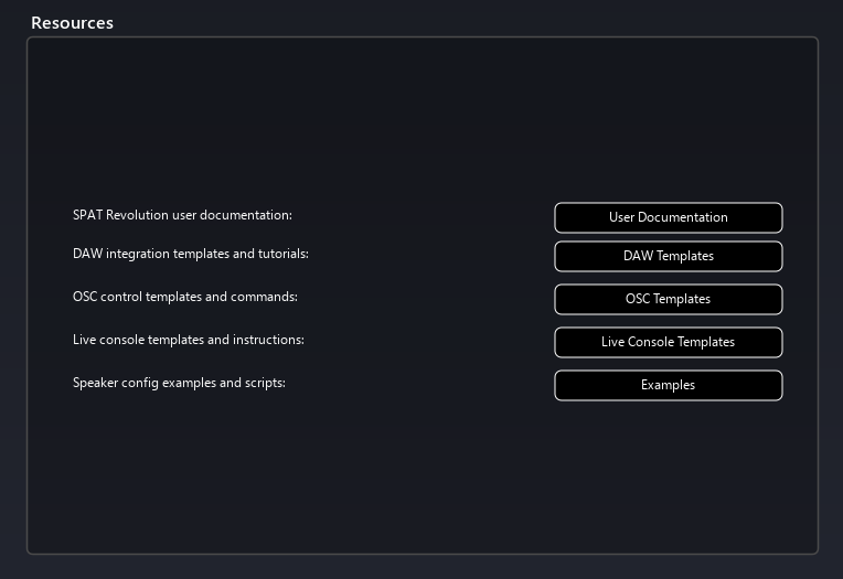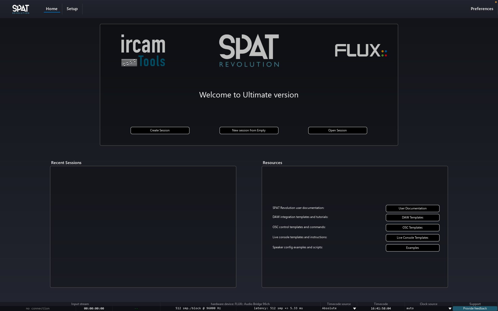 This page is the welcome page of SPAT Revolution. Here you can create sessions, open ones from disk or from a list of recent ones or access to the resources of SPAT Revolution.