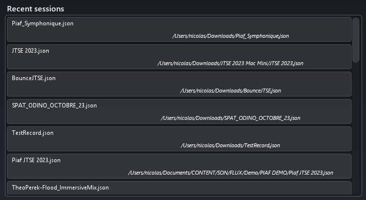 This box lists the latest open session in SPAT Revolution. You can open one by double-clicking on it.