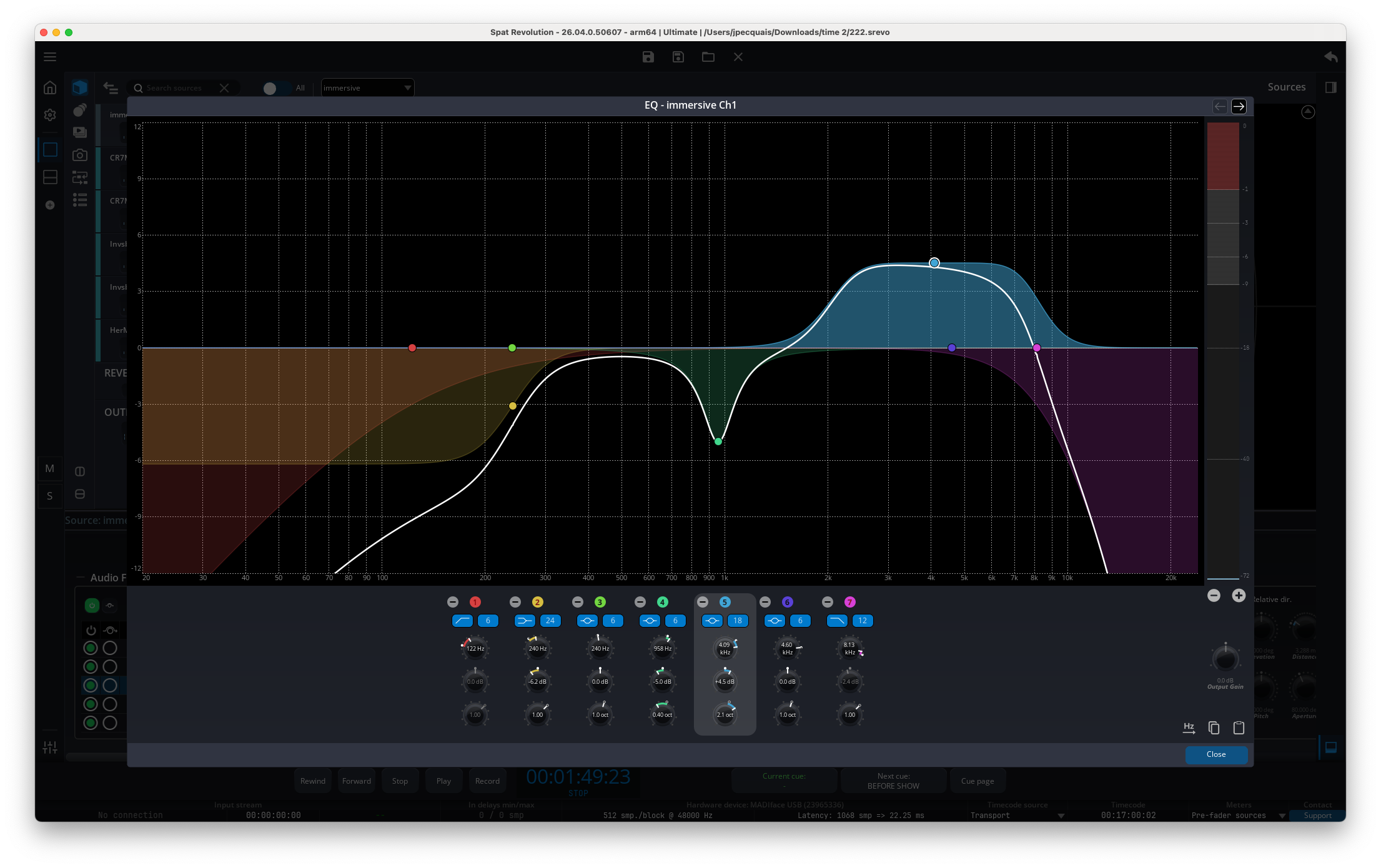 The Output EQ is the ideal destination for system tuning corrections from MiRA Analyzer. After measuring each speaker in your system with MiRA, you can copy the corrective EQ curve and paste it into the corresponding output channel’s EQ in SPAT Revolution. This gives you per-speaker room correction directly within your spatialization workflow.