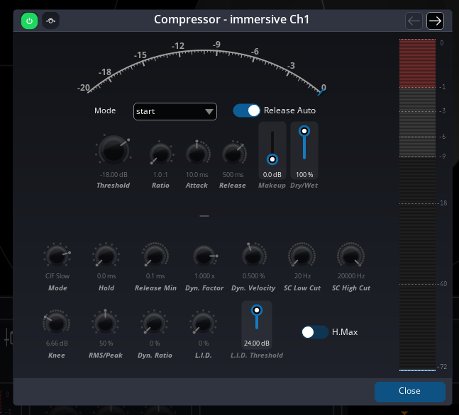 - H.Max — When enabled, the threshold is determined by the maximum of the RMS/peak detection or the dynamic detection, making the compressor more reactive to signal content.