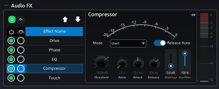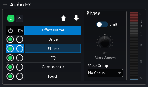 - Sources — The full effect chain is available: Drive, Phase, EQ, Compressor, and Touch. These effects are applied before spatialization, meaning they shape the sound of each source before it is placed in the room. You can access them from the source’s Audio FX panel in the Source Properties inspector.