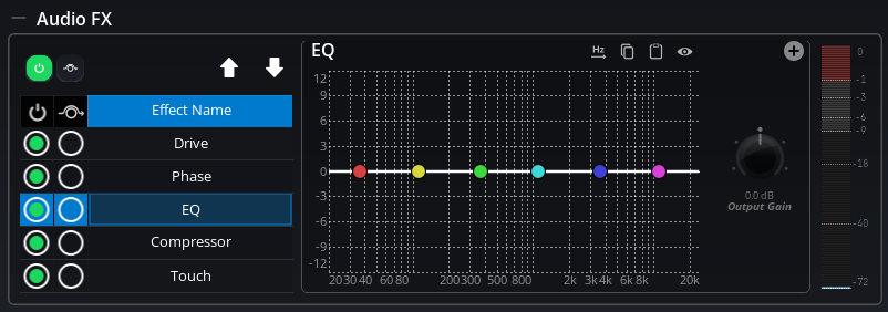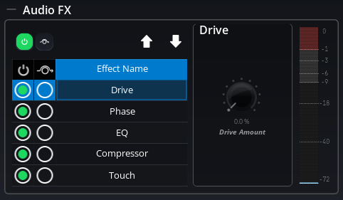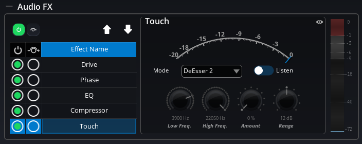 You can reorder the effects using the Move Up / Move Down buttons in the FX list grid to suit your needs. For example, you might want to place the Touch de-esser before the compressor, or move the Drive after the EQ.