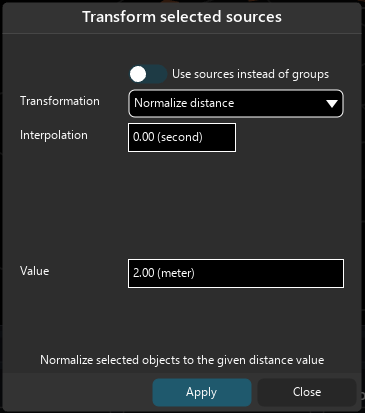 As with the custom speaker arrangement editor, we can apply some transformations to one or multiple sources. This feature is especially handy if you wish to quickly set sources on a circle or to put a selection of sources at a given distance for example.