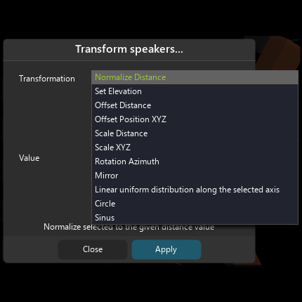 To modify a speaker arrangement with a predefined action, you can use the “transform” menu. To access it, click on the Transform button. A pop-up window will appear.