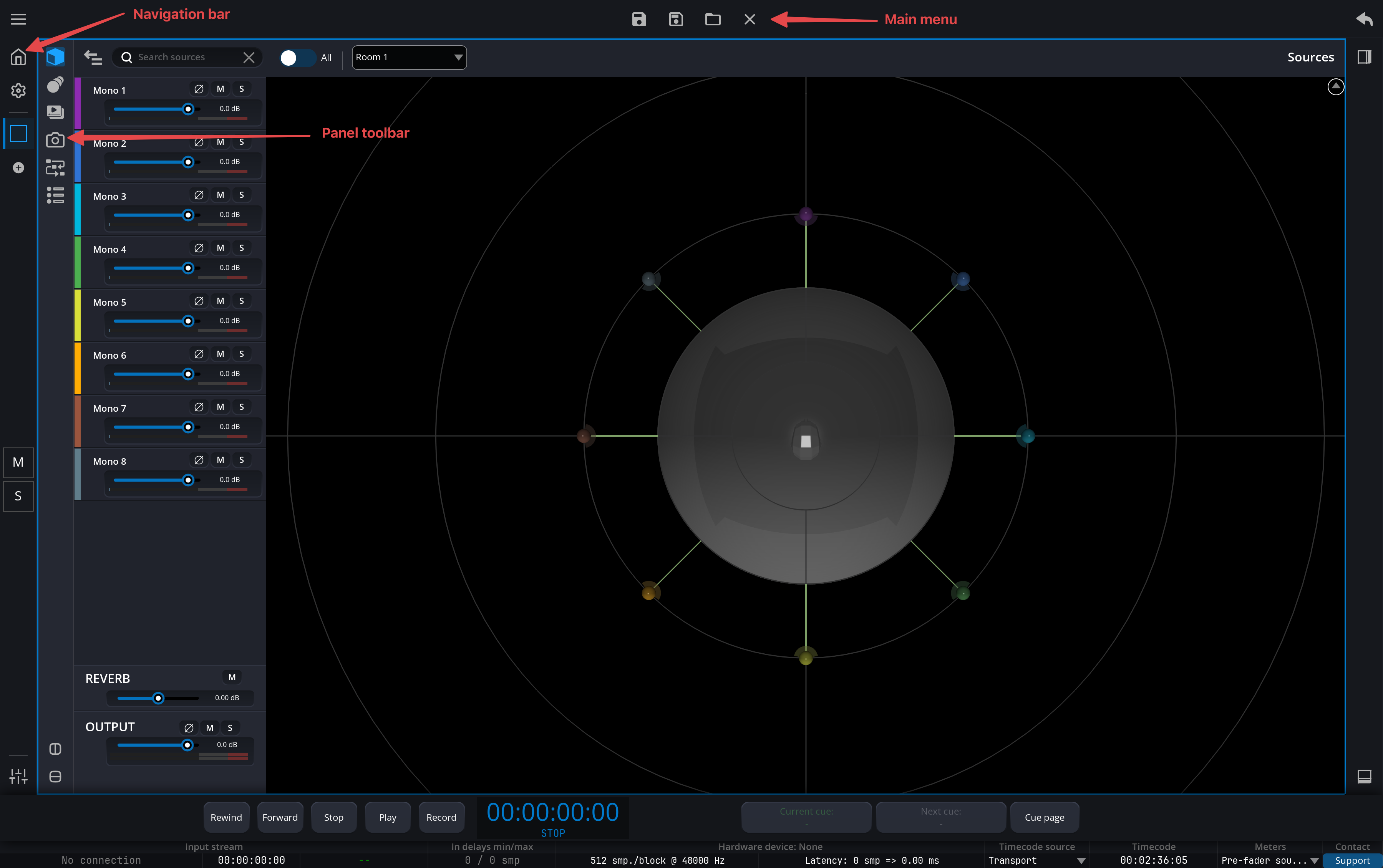 The SPAT Revolution user interface is designed to give you quick access to all the tools you need for spatial audio production. This page provides an overview of the main interface elements and how to navigate between them.