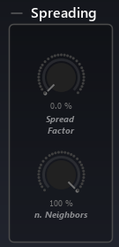 What makes this particularly interesting is that different sources can activate less or more of the sound system dynamically and in a very smooth way. For example, one virtual sound source might seem to pop in and out of individual speakers because its Nearest Neighbors Spread parameter is set at a low percentage, while another sound source could seem to diffuse over the entire sound system because its spread variable is set to 100%. For example, on a 10-speaker arrangement: 1-10% will use 1 speaker, 11% to 20% 2, and so on.