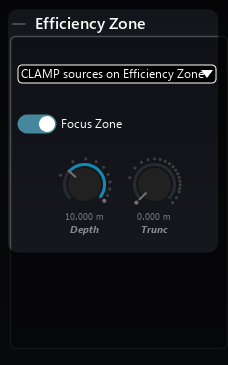 When using the WFS panning technique on a collinear frontal line arrangement, the Efficiency zone section in the room output section provides an option to activate the focus zone, i.e. the zone in front of a line of speakers. It is deactivated by default as it is recommended that a certain density and spacing exist for the speaker arrangement.
