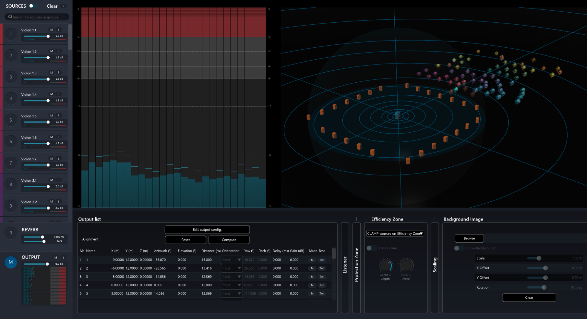 Gain scaling: This parameter allows scaling of the computed gains for all sources. It is really useful on close WFS line, in order to spread the audio content all along the line or speaker setup, for front-fills for example. For example, you can decrease the percentage in order to activate more loudspeakers serving well audience sitting close to the loudspeaker line.
