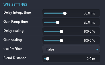 Delay interp. time: The delay interpolation time is the time it will take to go from one delay value to another delay value. In WFS, interpolation time allows a smooth transition when a source is moved. Depending on your source content, and your scene movements, you may find this setting useful to modify.