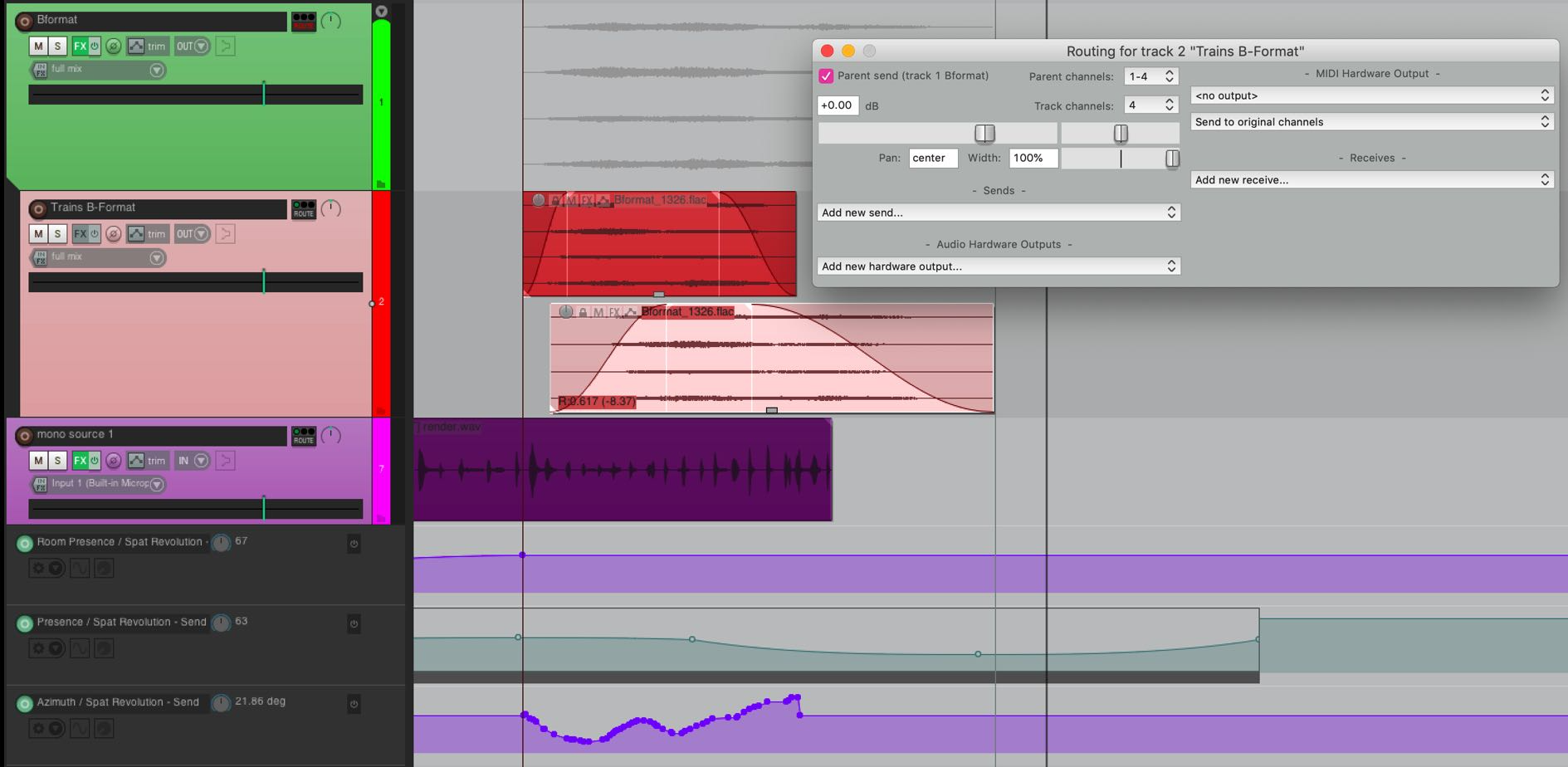 This is the least complicated way to build up a large project because the automation for the spatialization is managed in one place even though source material may be different at different stages of the composition. It may not always be necessary to have a different SPAT SEND source/objects for every audio file. The source automation can change the envelope lanes of the Parent Folder, so child tracks share one SPAT SEND with the same format. This will make more sense in practice.