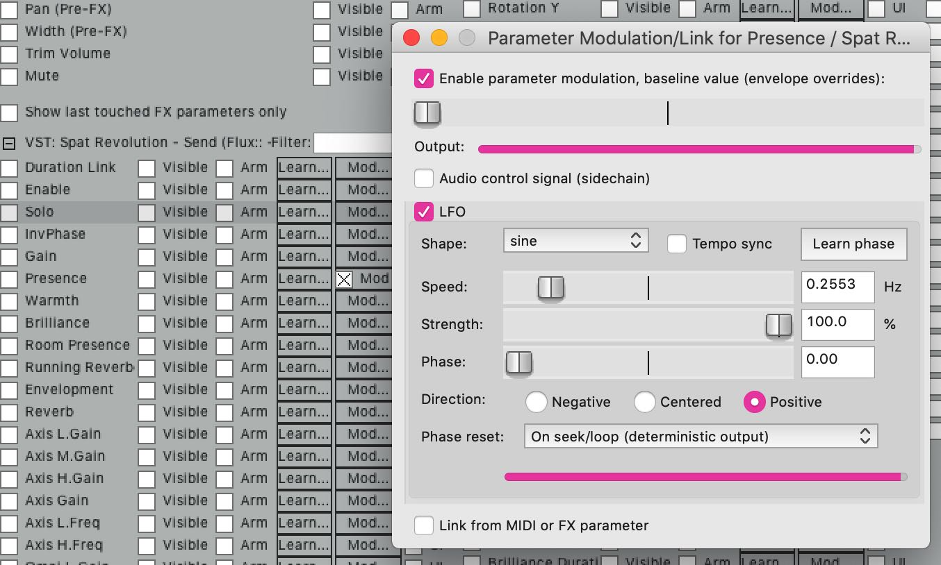 In Reaper, mapping any MIDI controllers (including 14-bit) to a Plug-In parameter is easy. This is a great way to control source properties like Azimuth or Yaw using external MIDI controllers, so you can control some sources live by hand during a performance or while mixing for example.
