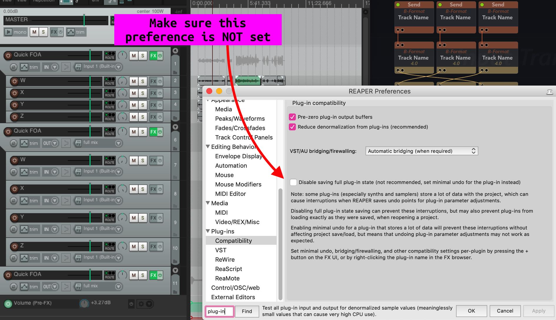 “Prevent Anticipative FX” should be enabled on tracks where SEND / RETURN are inserted.