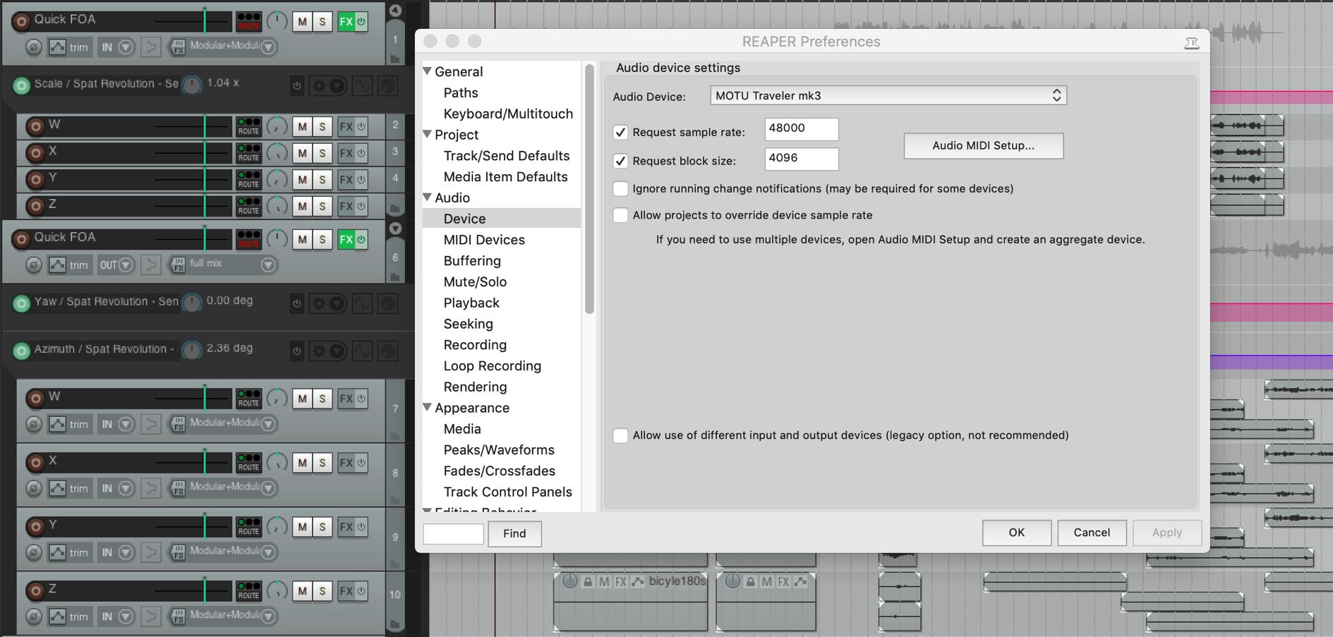 As described in section SPAT PI : Local audio path SPAT PI : Local audio path, when using the Local Audio path, the buffer size and sample rate must be matched in both SPAT Revolution and Reaper. In SPAT, you set this in the preferences and in Reaper in the Audio Device preferences.