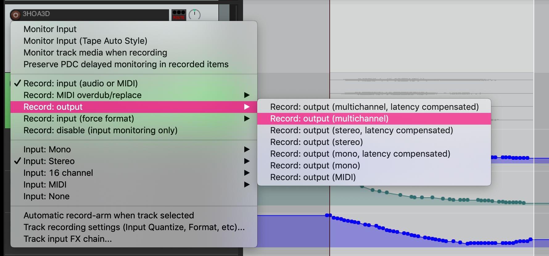 - the audio coming into the Track is a virtual audio path through the SPAT RETURN plug-in, so it will not appear at the Inputs list of the Track. Right-click on the track’s record arm button, and the Track record contextual menu will appear.