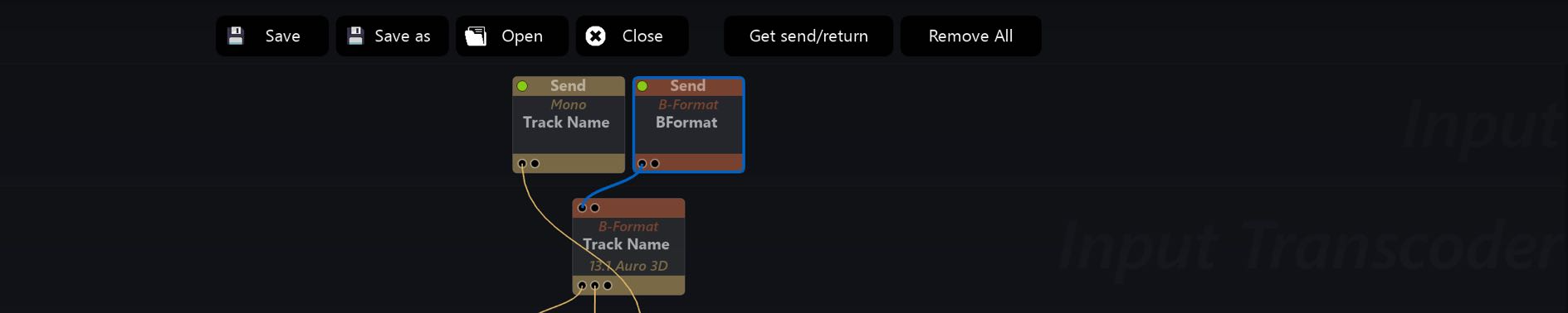 In the above screenshot, the Orange ’ BFormat ’ Send input is the one being routed by the SEND plug on the Parent Track on the previous example. At first, it will appear in SPAT as a Channel Based input by default - in this case it appeared as a 4.0 QUAD. If dealing with ambisonic 1st order such as AmbiX or B-Format, the input stream type in SPAT needs tobe assigned manually.