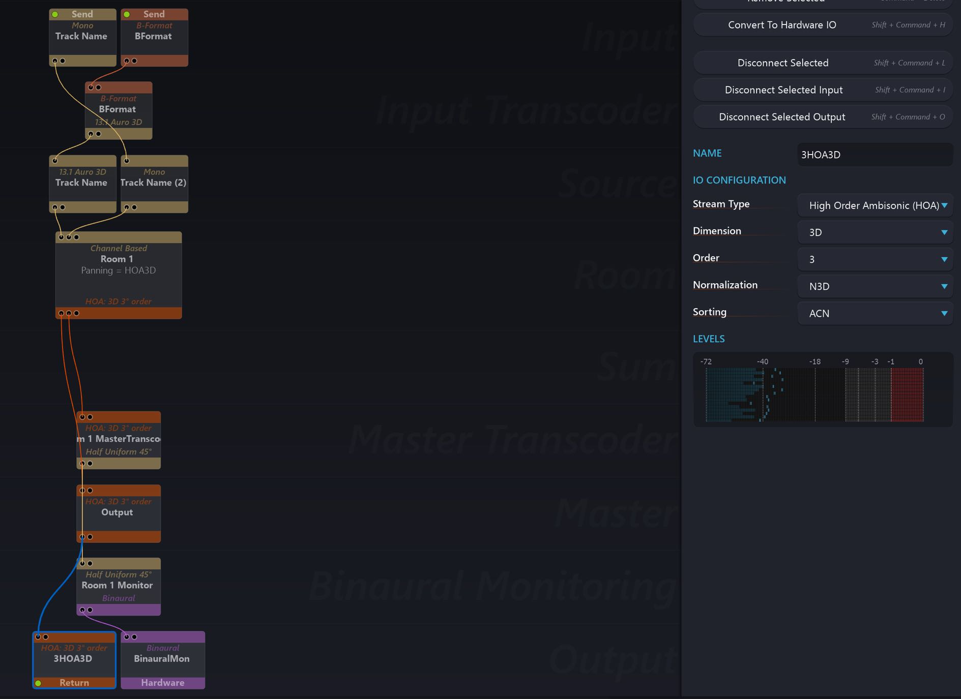 Enable the Local Audio Path: a Return output module should appear in the SPAT Setup Environment. Connecting it to the 3HOA3D stream output from the Room (or Rooms in a mixer/transcoder) and it should inherit the format.