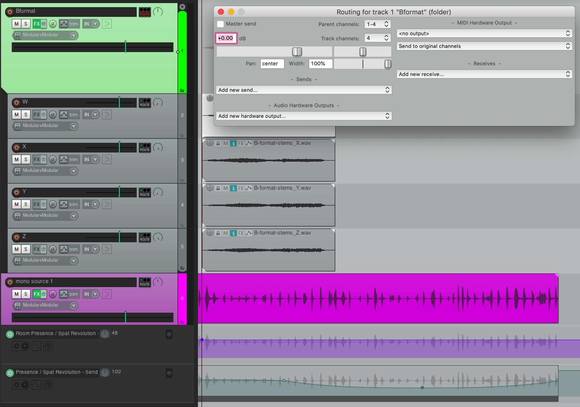 In the above screenshot, the B-Format Master has been set to be a Folder Parent with 4-Track Channel. Reaper channel routing is set on a track by track basis, using the TrackIO Route button of each Track. All the Child tracks routed to the parent can be assigned to one of the four receiving channels on the Parent track. In this example, the W is assigned to Track 1 by setting the track Pan to the left and routing to parent Channels 1-2. Similarly, the X to Track 2 (setting the track Pan to the right). The Y Track is assigned to Parent Channels 3-4 and hard panned left and so on.