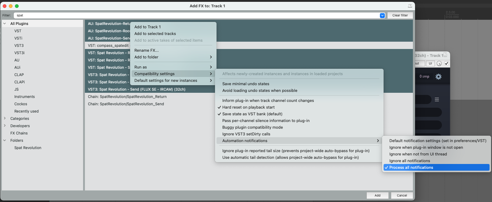 If you don’t want this behavior to be global, you can enable it for specific plug-ins. To do this, open the FX Browser, search for SPAT plug-ins and select all three. Then right click and go to “Compatibility settings”, “Automation Notifications” and select “Process all notifications”.
