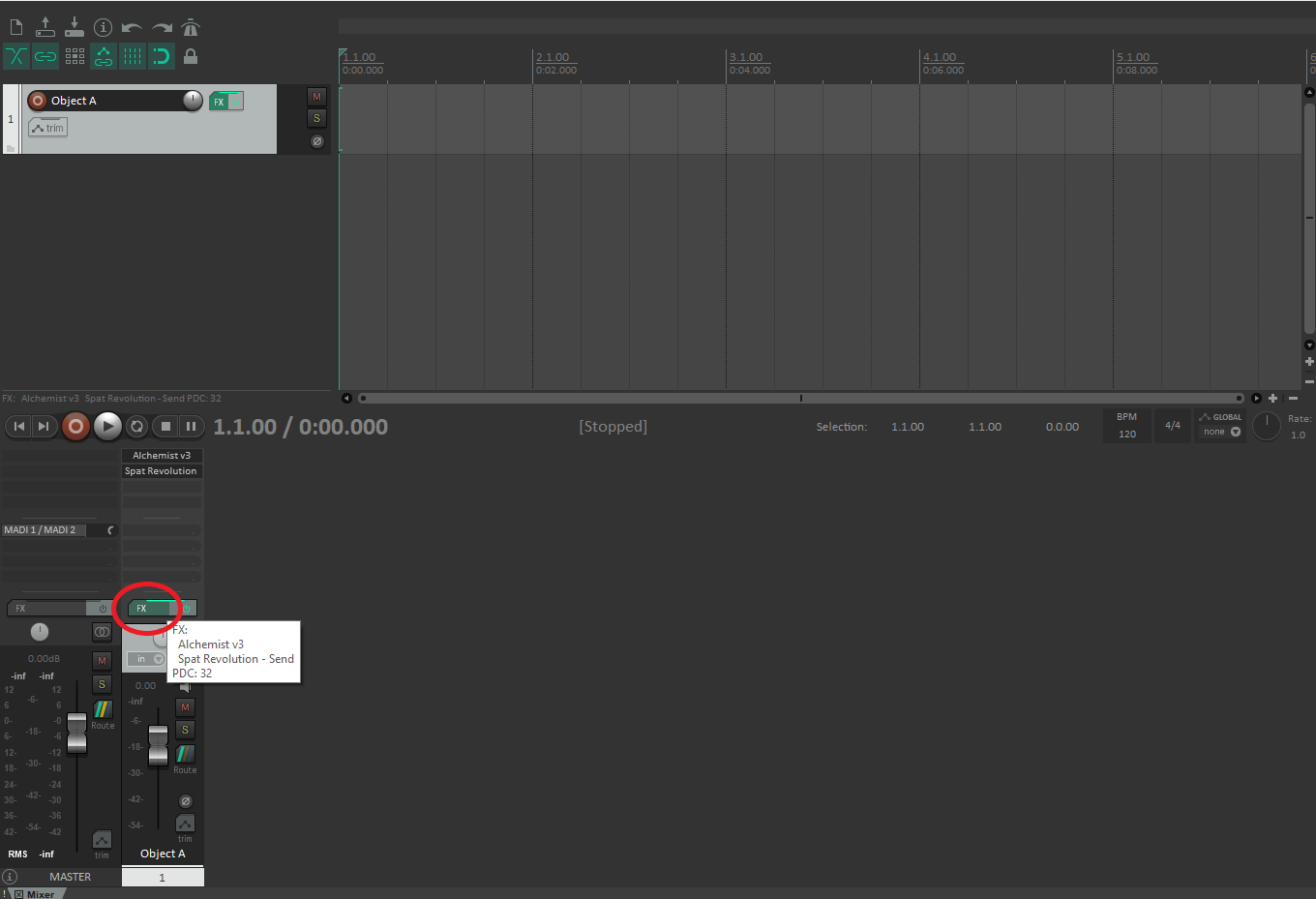 To access the latency information in REAPER, open the FX windows by clicking on the FX button.