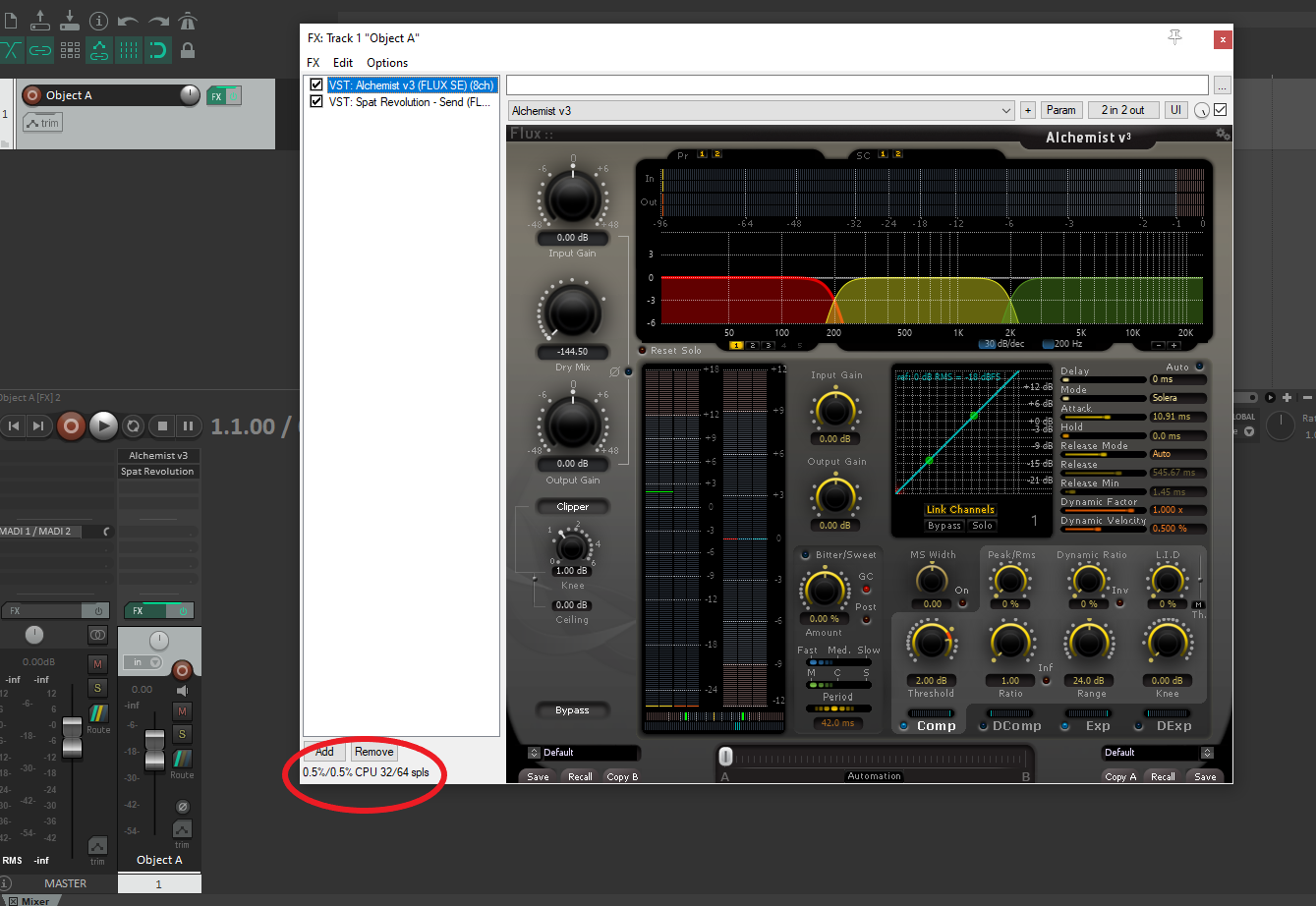 In this window, REAPER will show you two latency values. The latency of the currently selected plug-in and the actual latency added to the signal chain. REAPER always round up to a multiple of blocks. You should report the sum of all the plug-in latency in the SPAT Plugin (ergo, not the latency actually added by REAPER).