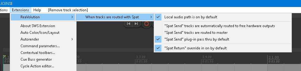 This option allows to configure the default behavior of sending audio to and receiving audio from SPAT Revolution. By default, the local audio path, which allows sending audio from Reaper to SPAT using virtual audio pipe, is on, the same as the thru option of SPAT send plug-in and the override option of SPAT Return plug-in.